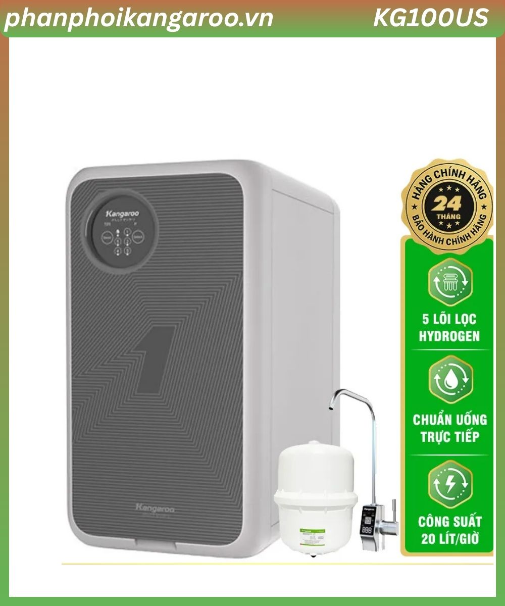 Kangaroo Hydrogen KG100US là thế hệ máy lọc nước mới nhất với những tính năng thông minh vượt trội. Thiết kế nhỏ gọn, công suất lọc lớn 20L/h, cảnh báo thay lõi và hiển thị chất lượng nước sạch TDS ngay tại vòi,… KG100US sẽ là sản phẩm hoàn hảo dành cho gia đình bạn.